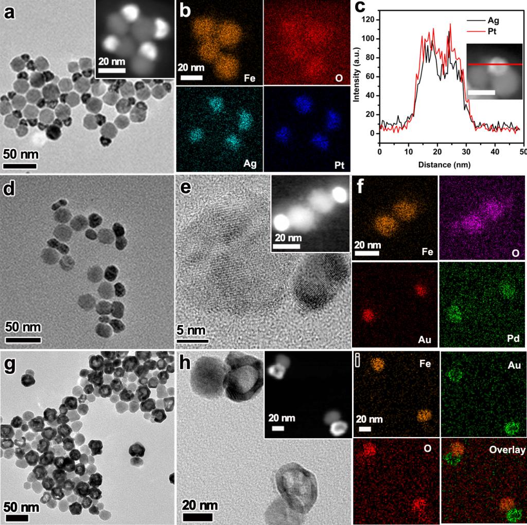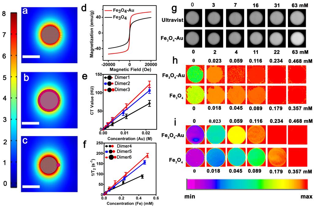 针对上述挑战,阎子峰教授团队的曾景斌课题组与殷亚东、张冬团队合作,发展了一种水相合成四氧化三铁-贵金属(金、银、钯)异质纳米材料的方法,通过以四氧化三铁纳米晶为种子,利用四氧化三铁表面的二价铁离子作为还原剂,原位的将金属盐前驱体还原成金属单质,而这些小小的金属种子如同钥匙一般,打开了水相合成的大门,后续加入的金属盐,在柠檬酸钠的作用下持续被还原并沉积到已有的种子上,在奥斯瓦尔德熟化作用下,形成大颗粒的金属,最终形成四氧化三铁-贵金属异质纳米材料。相比于基于有机溶剂的合成方法,水相合成法由于在水溶液中进行,可以通过外延生长法,对合成材料的粒径和形貌进行控制,也可以实现更复杂异质结构的可控制备,如AgPt合金-Fe3O4、Au核@Pd壳-Fe3O4、Au壳-Fe3O4等异质体的制备。研究人员进一步将合成的异质纳米材料应用到磁共振成像(MRI)/计算机断层扫描(CT)/光声(PA)成像/光学相干断层扫描(OCT)多模态生物成像,其成像效果与临床上商用的造影剂比较,具有一定的优越性,显示出良好的应用前景。