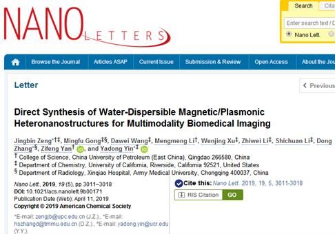 【本站讯】近日,我校理学院曾景斌副教授与陆军军医大学张冬教授、加州大学河滨分校殷亚东教授合作,在磁性/等离激元异质纳米材料研究中取得新进展,相关论文《亲水性磁性/等离激元异质纳米结构的合成及多模态生物成像应用》(Direct Synthesis of Water-Dispersible Magnetic/Plasmonic Heteronanostructures for Multimodality Biomedical Imaging)在国际材料领域权威期刊Nano Letters上发表。曾景斌为该论文第一/通讯作者,殷亚东教授、张冬教授为共同通讯作者。中国石油大学(华东)为第一署名单位,该研究得到国家自然科学基金和中央高校基本科研业务费资助。