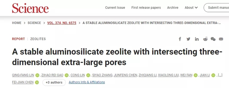 2021年12月24日,蚌埠医学院陈飞剑课题组与中国石油大学(华东)陈小博课题组、北京大学课题组以共同通讯单位在Science上发表了文章“A stable aluminosilicate zeolite with intersectingthree-dimensional extra-large pores”,报道了首例具有三维交叉16元环孔道系统的全连接、超大孔硅酸铝盐分子筛ZEO-1。审稿专家对该成果给予高度评价,认为ZEO-1是铝硅酸盐沸石领域的新突破,对推动沸石材料合成、催化、石油石化等相关领域的发展具有重大意义。
